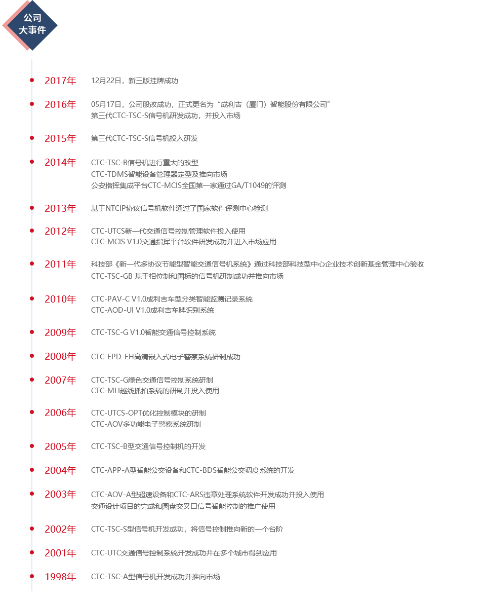 成利吉(廈門)智能股份有限公司,成立于1998年,是國內(nèi)最早從事智能交通領(lǐng)域產(chǎn)品研發(fā)和應(yīng)用、專業(yè)智能交通核心軟件開發(fā)、智能交通系統(tǒng)集成與運營服務(wù)的企業(yè)之一。公司于2016年5月正式更名為成利吉(廈門)智能股份有限公司,并于2017年12月22日新三版成功掛牌。